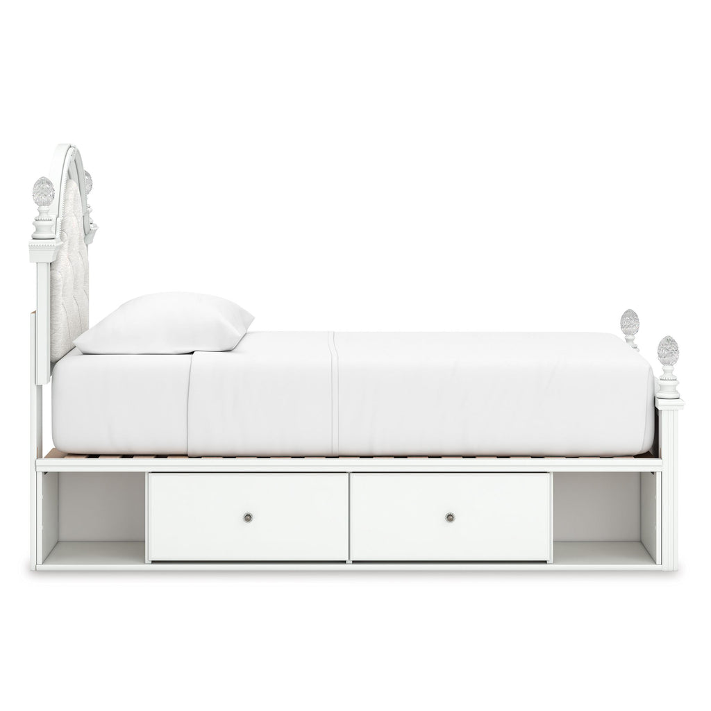 • Includes upholstered panel headboard, panel footboard, roll slats and side storage with rails